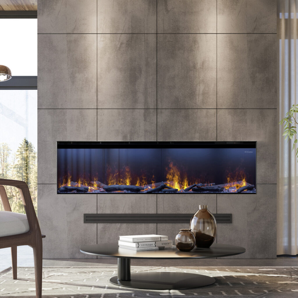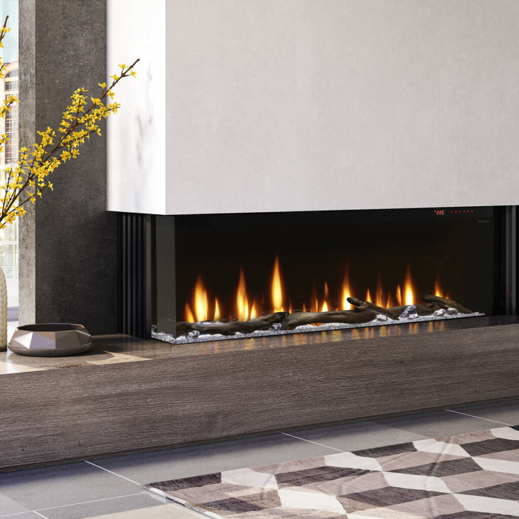 Ignite® Evolve, part of the Ignite® family of electric fireplaces, brings the future of electric fireplaces to life with a sleek, minimalist design and exceptional flame realism. Available in 50″, 60″, 74″, and 100″ widths, it installs flush into a 2×6 wall with or without trim for a seamless, modern aesthetic. Powered by Multi-Fire® flame technology and Comfort$aver® heating, Evolve delivers efficient warmth and immersive ambiance through lifelike driftwood, tumbled glass, and crystal media options. With Flame Connect App control, ambient light sensing, and self-diagnostic intelligence, Ignite® Evolve transforms everyday comfort into an effortless experience of innovation and style.